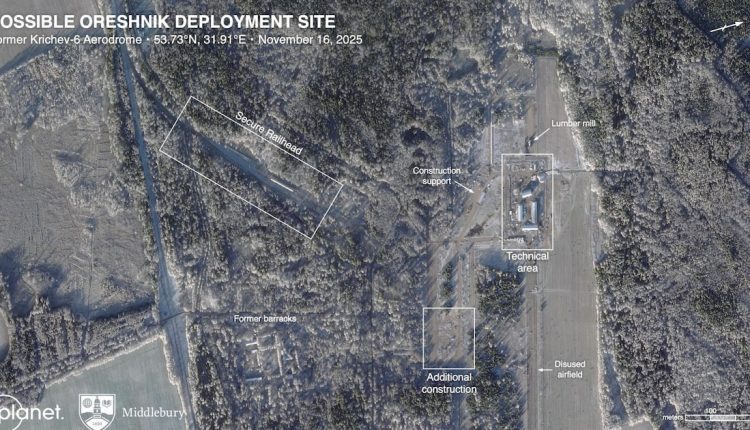 Lewis y Eveleth detallaron que su conclusión se basa en imágenes que muestran instalaciones compatibles con una base de misiles estratégicos rusos, afirmando con un 90% de certeza que lanzadores móviles de Oreshnik serán estacionados en la antigua base aérea cerca de Krichev, a unos 307 kilómetros al este de Minsk y 478 kilómetros al suroeste de Moscú. Rusia probó un Oreshnik armado convencionalmente contra un objetivo en Ucrania en noviembre de 2024. Putin ha presumido que este misil es imposible de interceptar, al superar presuntamente velocidades de Mach 10.