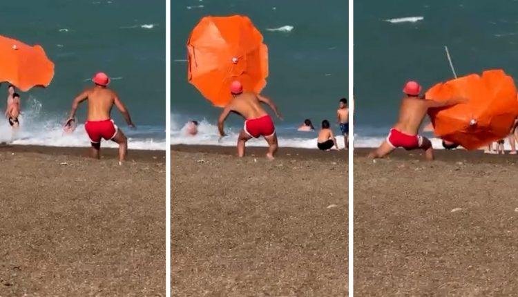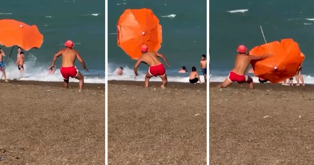 El video registrado muestra la intervención inmediata del hombre lo que también puso en evidencia otra ineficiencia de los turistas: la escasa o nula supervisión a la hora de colocar correctamente una sombrilla en la playa y cotejar desde qué dirección sopla el viento para evitar el “embolsamiento” de aire con la tela del accesorio playero.