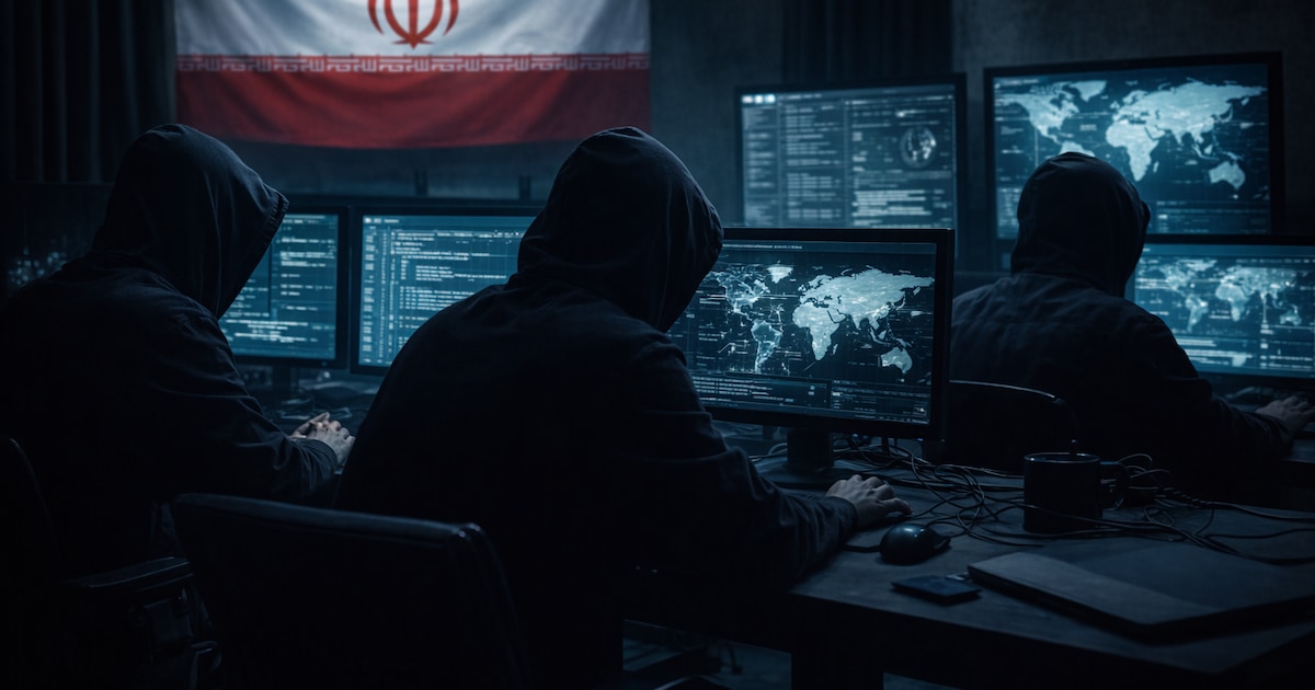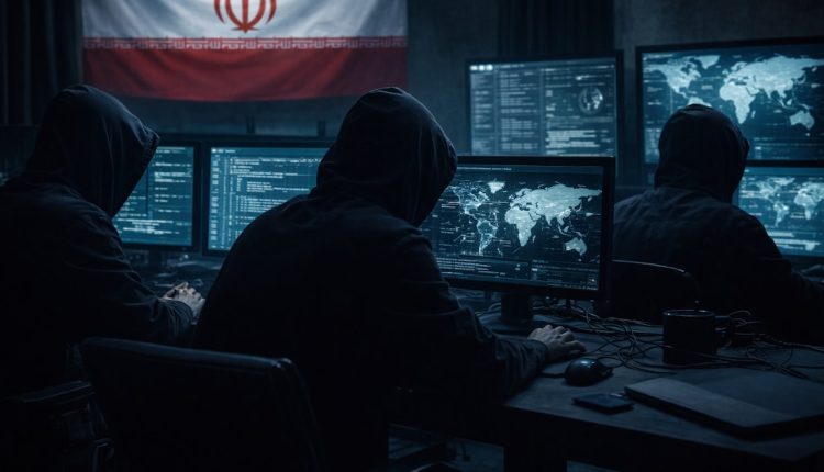 Tres personas encapuchadas sentadas de espaldas, usando computadoras con múltiples pantallas que muestran código y mapas globales, frente a una gran bandera de Irán.