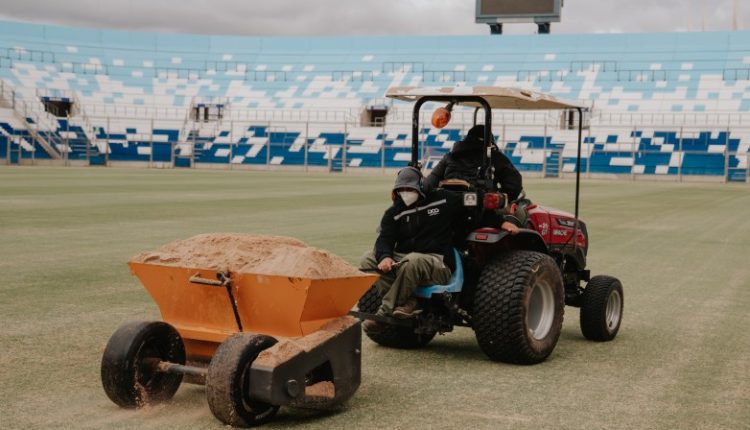 En el Estadio del Bicentenario, uno de los trabajos más importantes es la preparación del campo de juego para el partido de Los Pumas. Esta tarea demanda planificación, tiempo y precisión técnica. Primero se realiza el corte del césped existente para dejar la superficie en condiciones. Luego se aplica la semilla Meridian Gold, adecuada para reforzar la cobertura vegetal del campo. Posteriormente, se incorpora arena, lo que permite mejorar el asentamiento de la semilla, nivelar la superficie y favorecer el desarrollo del nuevo césped.